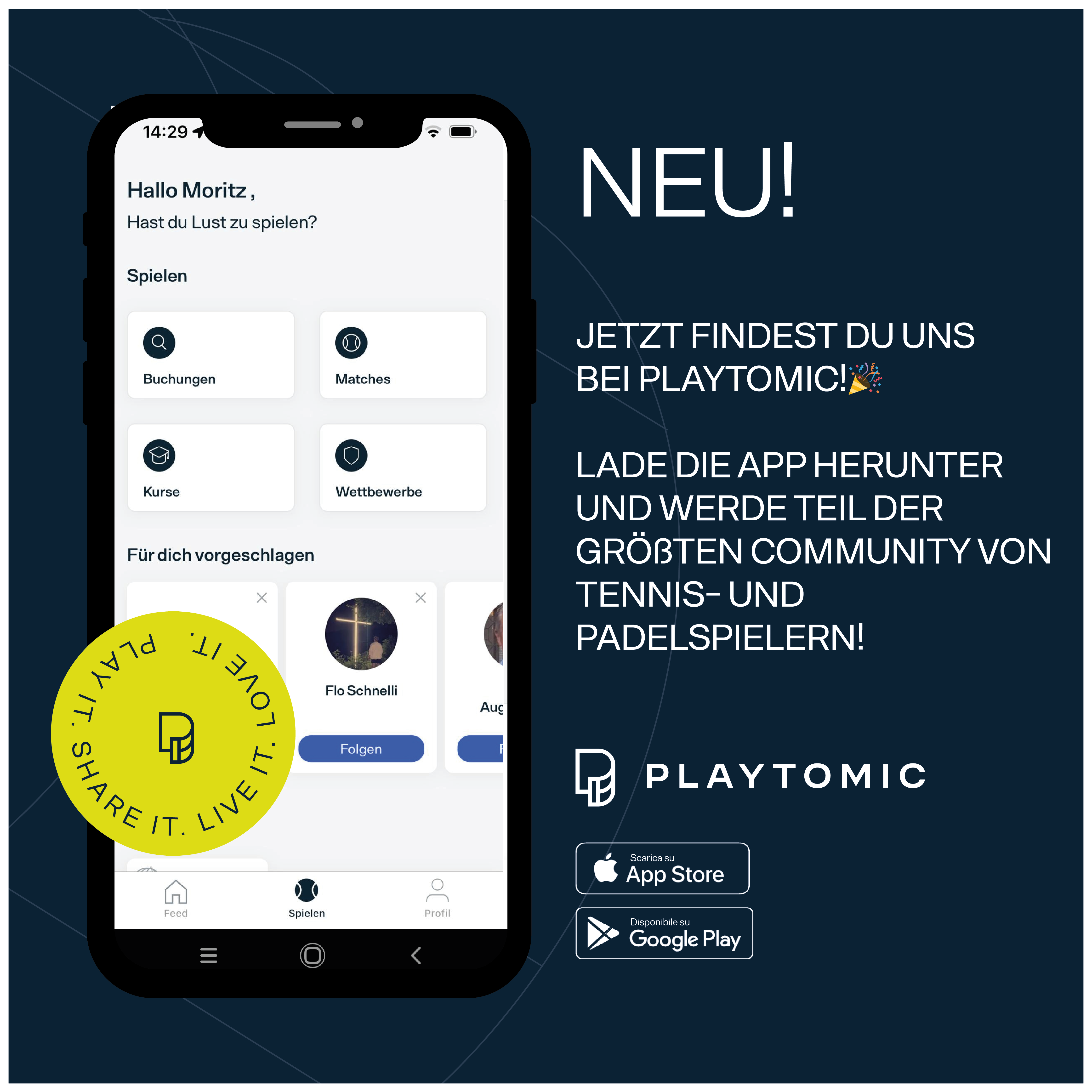 Bitte Plätze nur über die playtomic APP buchen. Buchungen über die playtomic Webseite können nicht verarbeitet werden. Wir bitten um Verständnis.